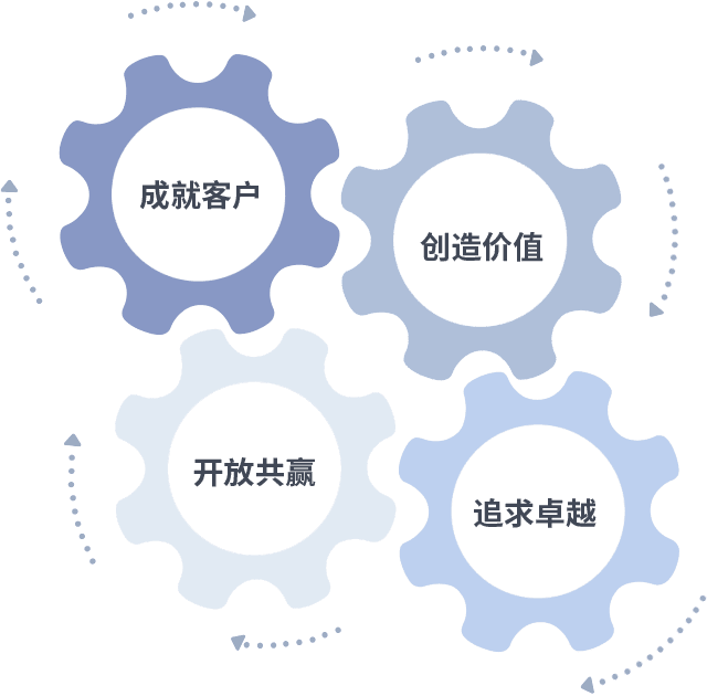 成就客户是一切决策的出发点,,创造价值是衡量所有工作的标准,,追求卓越是我们做事做人的态度,,,,开放共赢是我们的格局也是最终的结果。。价值观的齿轮环环相扣,,推动着组织里的每个人不断向前。。。。