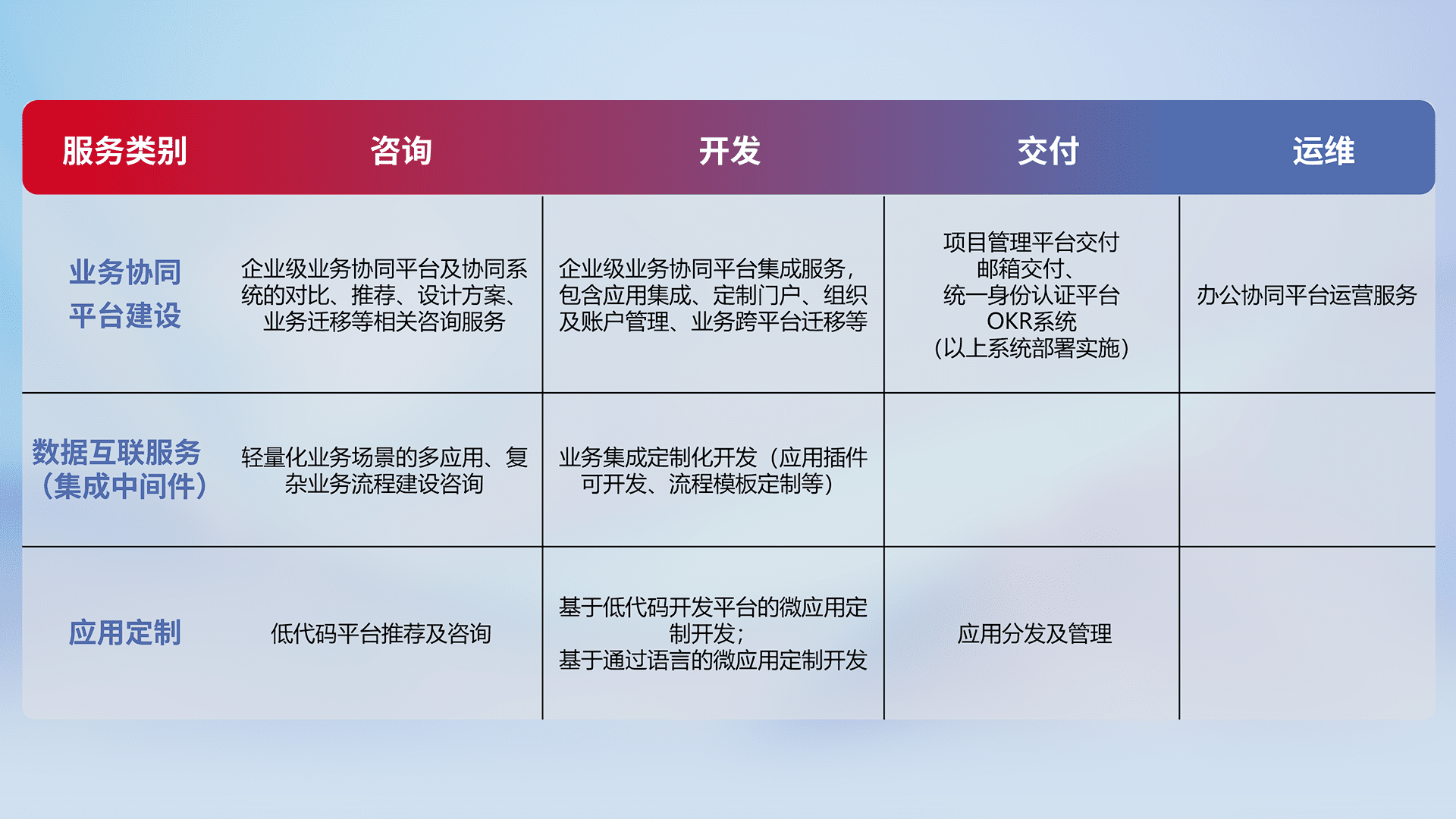 针对钉钉、、、、企微、、、、IDaas等平台级产品提供产品的规划、、、方案、、、、交付、、定制化开发等服务,,,实现如统一协同办公、、、智能客户服务、、、、混合会议管理、、、、智能数据查询、、等业务场景,,实现数字化转型。。。